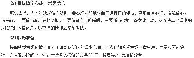 拿到試卷后,首先應(yīng)通覽一遍,了解題目的多少和難易的程度,以便掌握答題的速度,然后根據(jù)先易后難的原則排出答題的順序,先攻相對簡單的題,后攻難題。這樣就不會因?yàn)楣ルy題而浪費(fèi)時間太多,而沒有時間做會答的題,遇到較大的綜合題或論述題,則應(yīng)先列出提綱。再逐條論述。在答完試卷后,要進(jìn)行一次全面復(fù)查,特別注意不要漏題,跑題。要糾正錯別字,語法不通,詞不達(dá)意等錯誤。
