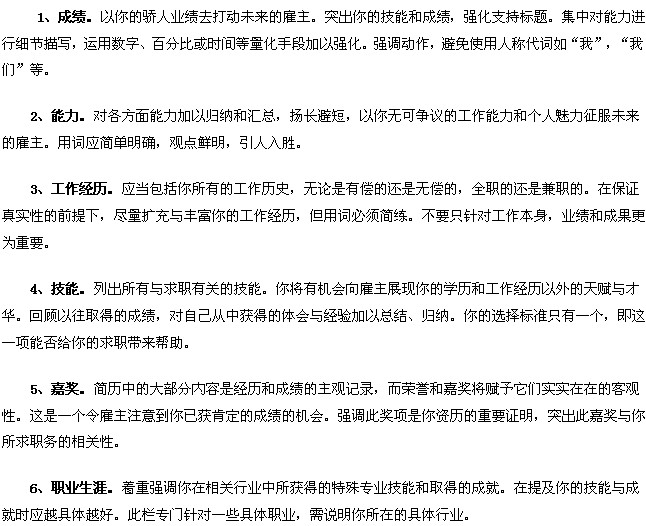 簡歷中有幾欄是用來給對方留下深刻印象的,也是決定對方是否給你面試機(jī)會的關(guān)鍵。如何寫好這幾部分的內(nèi)容很重要,請從以下幾個(gè)方面著手。