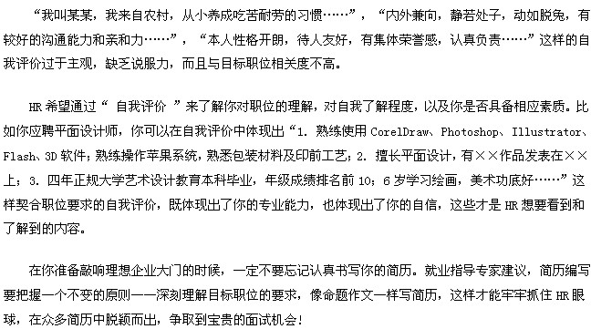 就業(yè)指導(dǎo)專家建議:當(dāng)你填寫個(gè)人簡歷時(shí),選一個(gè)可以靜下心來的場所,梳理好自己的頭緒:你要什么樣的工作?你有什么樣的優(yōu)勢(shì)?你有什么樣的發(fā)展計(jì)劃?而不是不經(jīng)過思考簡單將自己的經(jīng)歷和信息全部填進(jìn)各種表格,讓HR來判斷你能做什么。你需要思考,提煉和總結(jié),給出一個(gè)肯定和結(jié)論性的答案。像高考作文一樣慎重對(duì)待你的簡歷,HR一定感受得到。