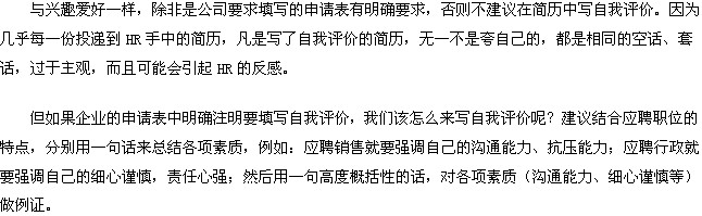 2.興趣愛好要具體,不能只是“運動、音樂、讀書”這樣概括性的詞匯,否則很難讓HR判斷你究竟喜好什么,更嚴重的會讓HR對你的寫作水平產生懷疑。
