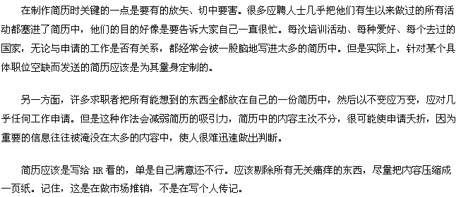 我們已經(jīng)清楚了簡歷中不該寫什么,那么我們應(yīng)該寫什么呢?個人詳情,包括姓名和聯(lián)系方式,是不可缺少的。要讓別人很容易地找到你。如果沒有特別要求,你不需要提供護(hù)照號碼、血型或婚姻狀況等信息。無關(guān)緊要的信息不會增加你獲得面試的機(jī)會,相反,由于它分散了讀者關(guān)注重要內(nèi)容的注意力,因此反而會幫倒忙,使你失去機(jī)會。