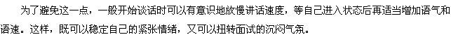 (4) 面試過(guò)程中注意控制談話節(jié)奏。進(jìn)入試場(chǎng)致禮落座后,若感到緊張先不要急于講話,而應(yīng)集中精力聽(tīng)完提問(wèn),再?gòu)娜輵?yīng)答。一般來(lái)說(shuō)人們精神緊張的時(shí)候講話速度會(huì)不自覺(jué)地加快,講話速度過(guò)快,既不利于對(duì)方聽(tīng)清講話內(nèi)容,又會(huì)給人一種慌張的感覺(jué)。講話速度過(guò)快,還往往容易出錯(cuò),甚至張口結(jié)舌,進(jìn)而強(qiáng)化自己的緊張情緒 ,導(dǎo)致思維混亂。當(dāng)然,講話速度過(guò)慢,缺乏激情,氣氛沉悶,也會(huì)使人生厭。