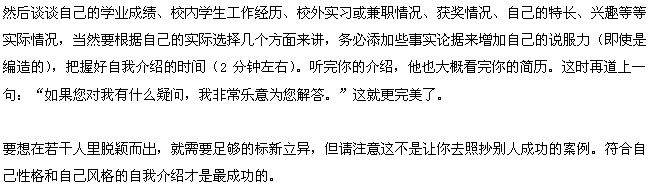 如無(wú)意外,面試官的視線會(huì)從簡(jiǎn)歷移到你身上,然后點(diǎn)點(diǎn)頭示意你可以開(kāi)始,這時(shí)別忘了我上述的兩大武器——望著對(duì)方,微笑地說(shuō)聲謝謝,然后開(kāi)始介紹自己的學(xué)校、專(zhuān)業(yè),主修學(xué)科的研究方向,再表明自己強(qiáng)烈的就業(yè)意愿:我很希望能成為貴公司的一份子,并能為它的發(fā)展略效綿力。